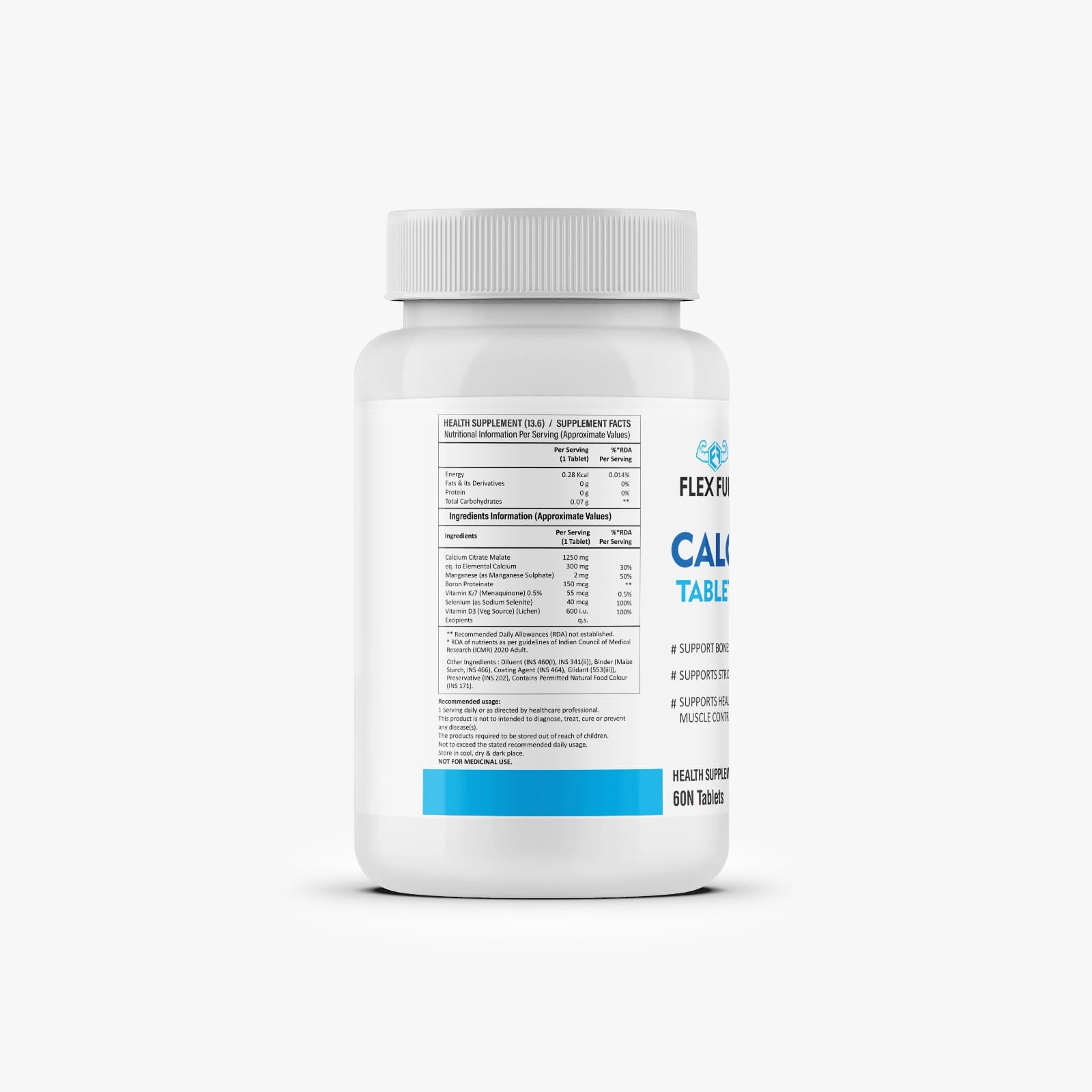 Flex Fuel Calcium Tablets are expertly formulated to support bone strength, muscle function, and overall skeletal health. Each tablet delivers a potent blend of Calcium Citrate Malate, Vitamin D3, Vitamin K2-7, Manganese, Boron, and Selenium — essential nutrients that play a crucial role in maintaining optimal bone density, promoting strong teeth, and aiding healthy muscle contraction.