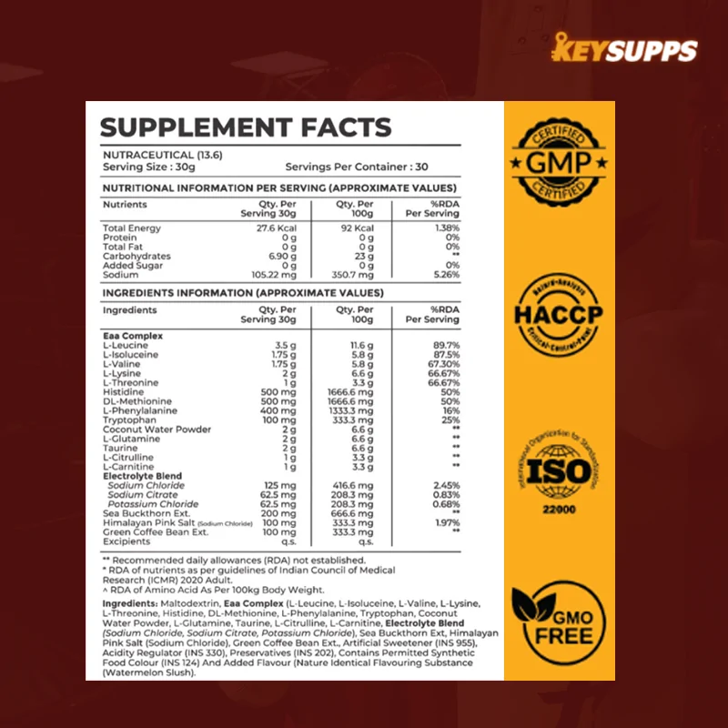 Available in refreshing Orange Crush and Watermelon Slush flavors, KeySupps EAA Maximus is the perfect addition to your pre- or post-workout routine, delivering premium quality and purity for athletes who demand the best.