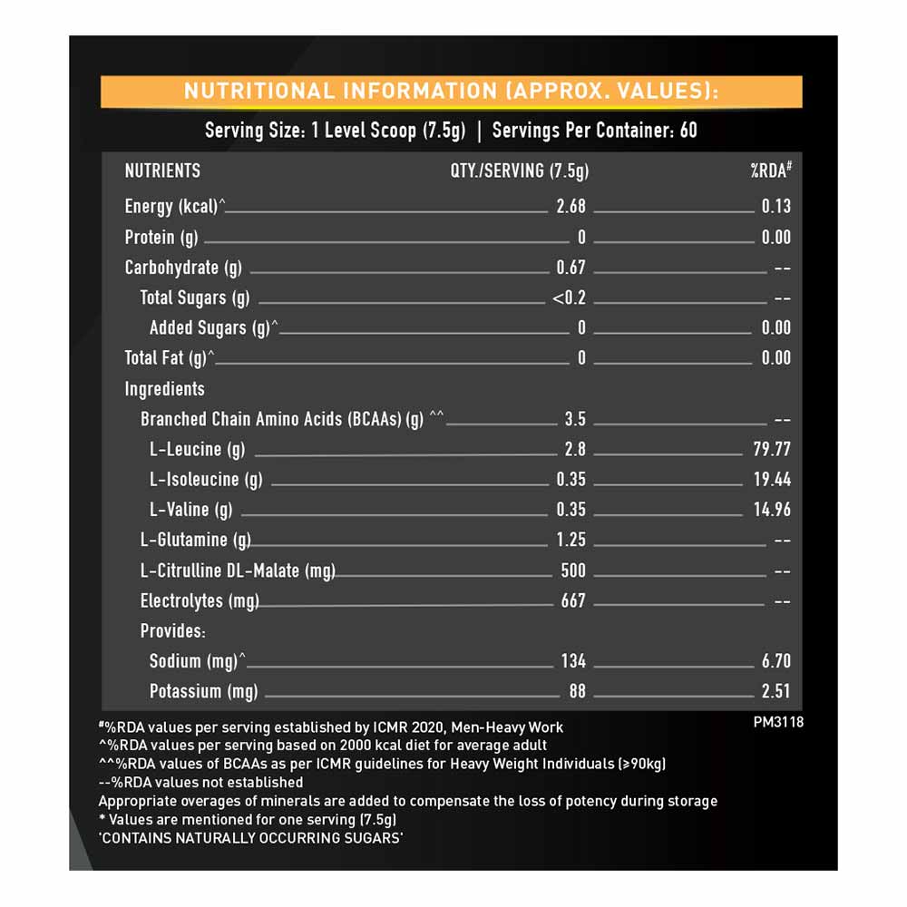 MuscleBlaze BCAA Gold is a breakthrough intra-workout fuel with an 8:1:1 ratio of branched chain amino acids including Leucine, Isoleucine, and Valine respectively. The common BCAA ratio found in regular intra-workout supplements is 2:1:1 with 2 parts of leucine over 1 part each for the other two BCAAs. A higher leucine content in your intra-workout fuel may prove a game changer as it activates the complex muscle building pathways when body undergoes a heavy duty workout. It enhances the synthesis of protein in the muscles thus helping in lean mass gain and faster recovery.