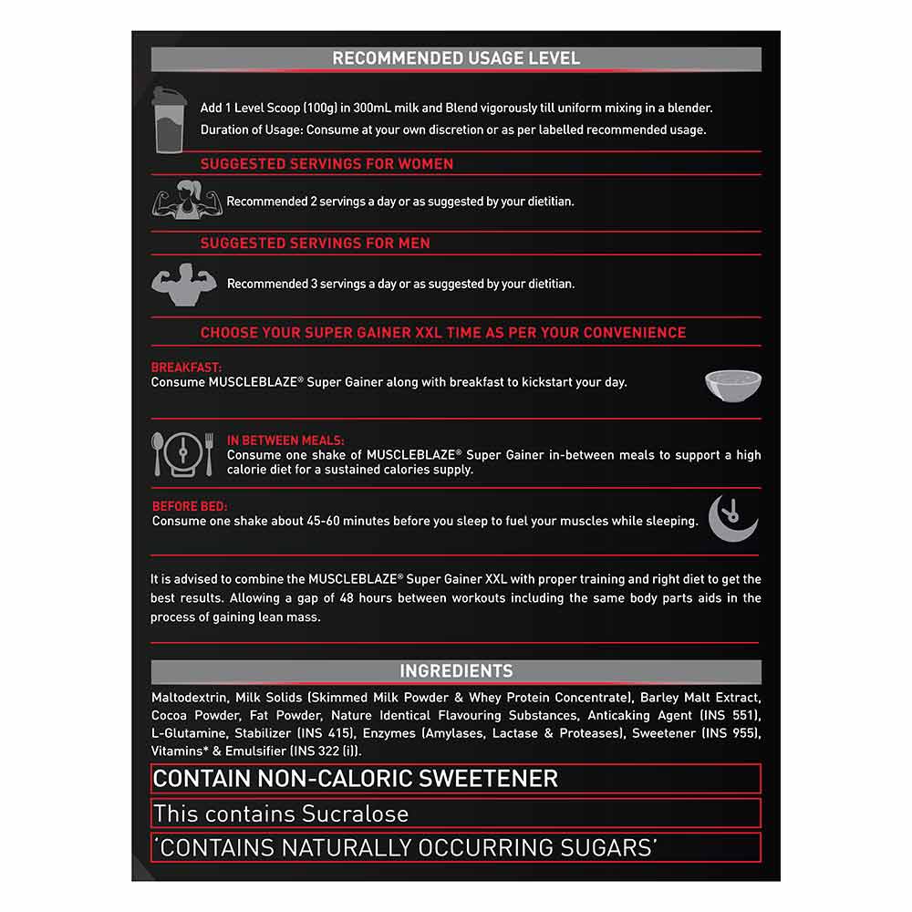 Recommended Serving – For best results, you must consume MuscleBlaze Super Gainer XXL, 2 kg/ 4.4 lb Cookies & Cream: