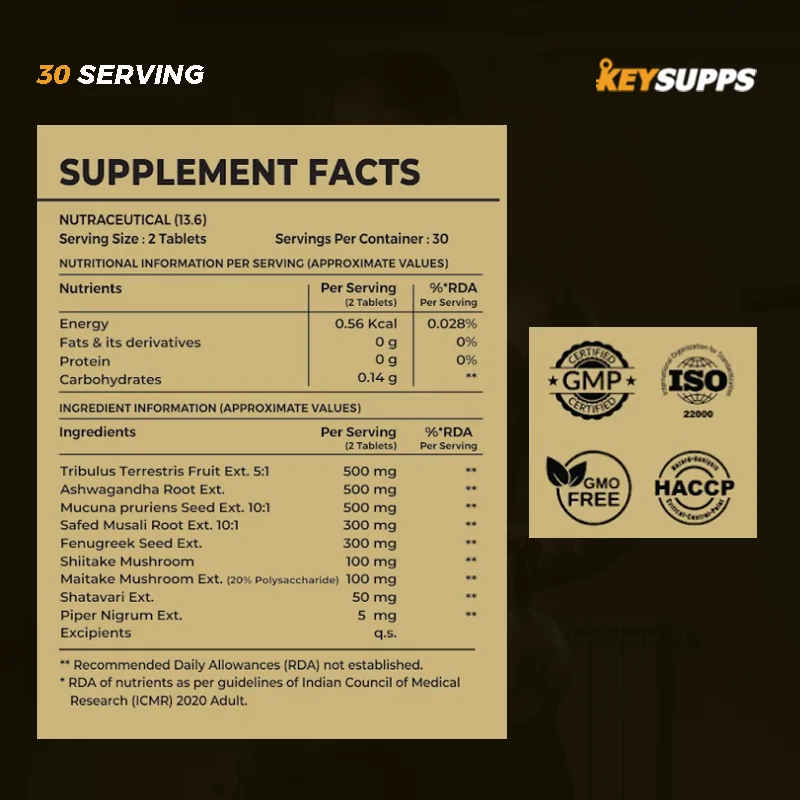 KeySupps Testosterone Gold is a premium herbal blend crafted to naturally boost testosterone levels, enhance vitality, and support overall performance. This powerful formula combines the ancient wisdom of potent adaptogens like Ashwagandha and Shatavari with scientifically backed ingredients such as Magic Shrooms and Tribulus Terrestris. These ingredients work synergistically to optimize hormonal balance, improve stamina, and support muscle growth, making Testosterone Gold the ideal choice for those looking to enhance their physical and mental performance.